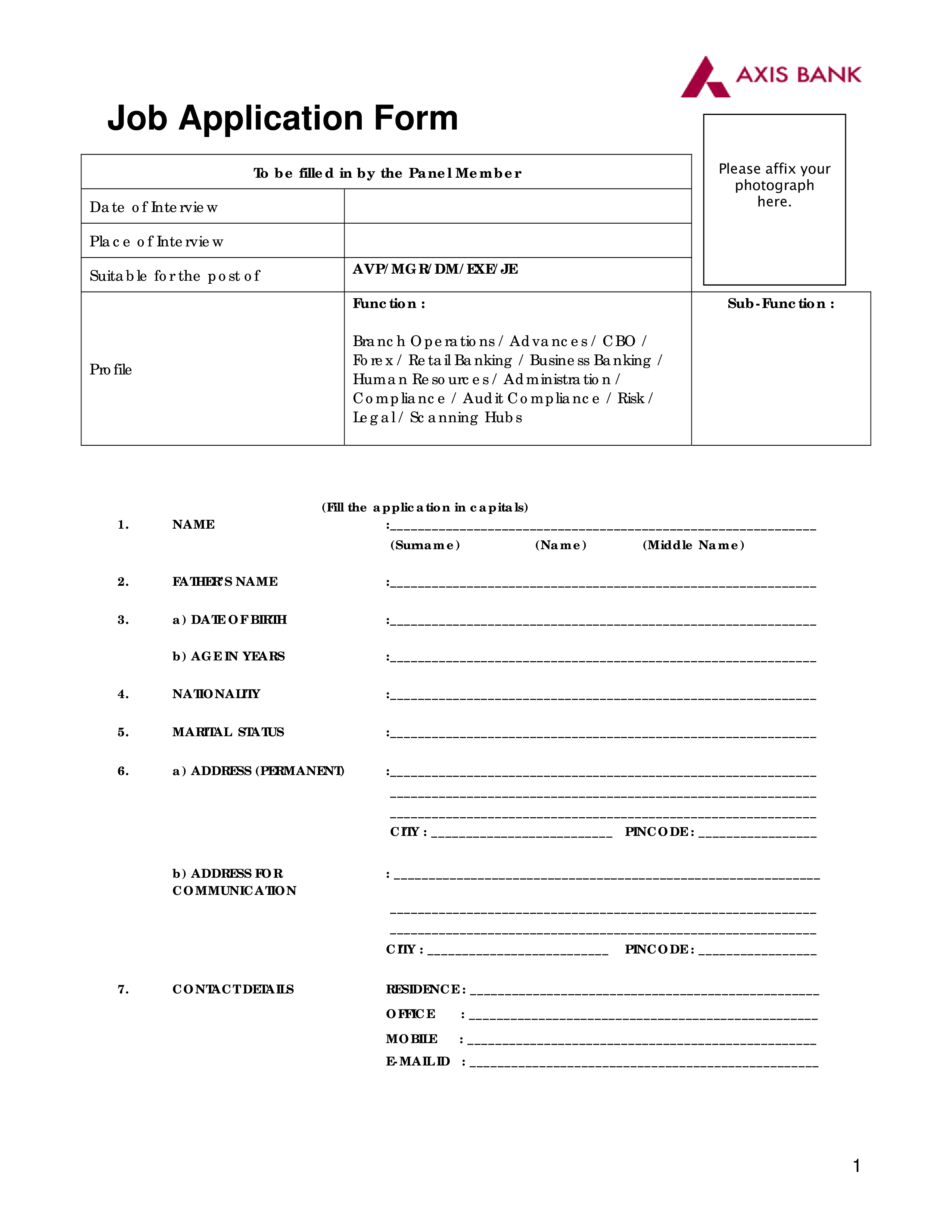 Place of Interview AVP/MGR/DM/EXE/JE Suitable for the post of Function : Sub-Function : Branch Operations / Advances / CBO / Forex / Retail Banking / Business Banking / Human Resources / Administration / Compliance / Audit Compliance / Risk / Legal / Scanning Hubs Profile (Fill the application in capitals) : (Surname) (Name) (Middle Name) 1.. a) ADDRESS (PERMANENT) : CITY : PINCODE : b) ADDRESS FOR COMMUNICATION : CITY : PINCODE : 7..