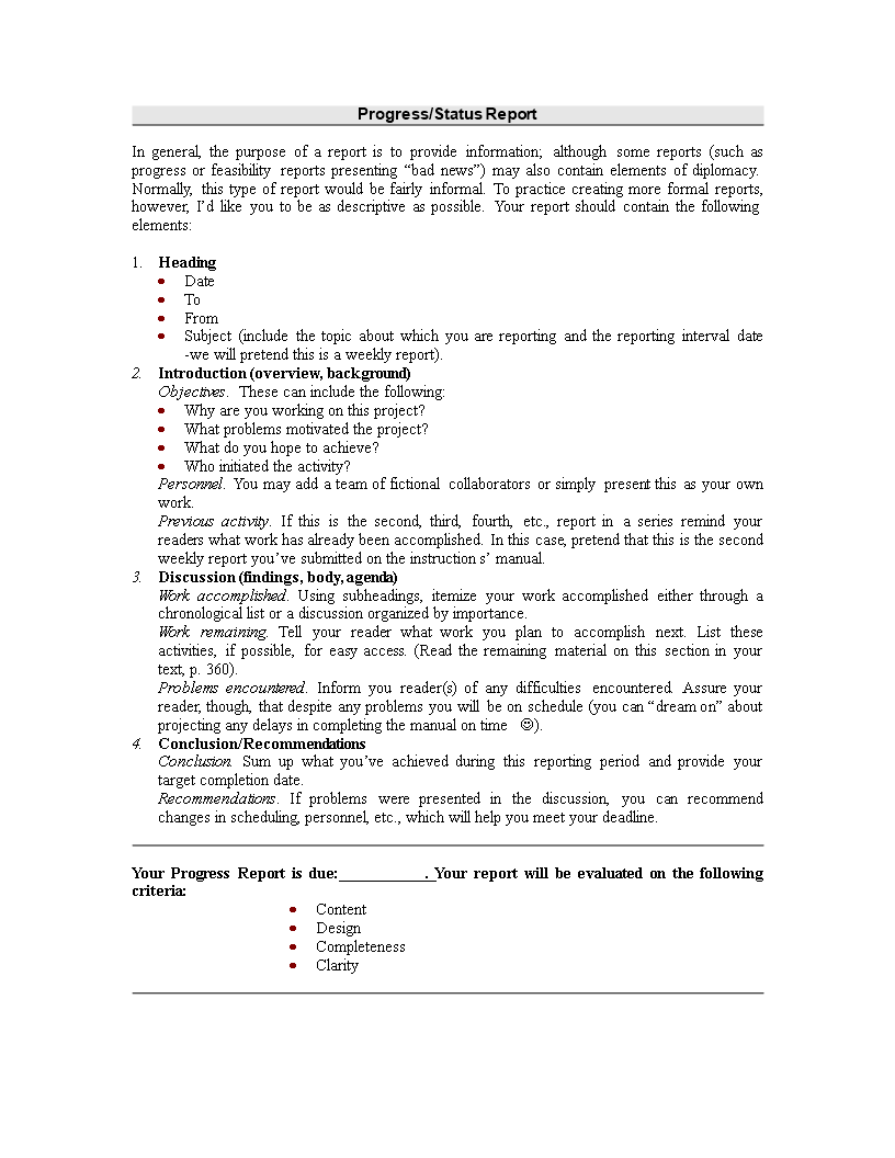 .docFeel free to download this Progress Status Report, or simply browse through our other basic or advanced template designs. They are intuitive and in several kinds of formats, such as: PDF, WORD, XLS (EXCEL including formulas and can calculate sums automatically), etc.