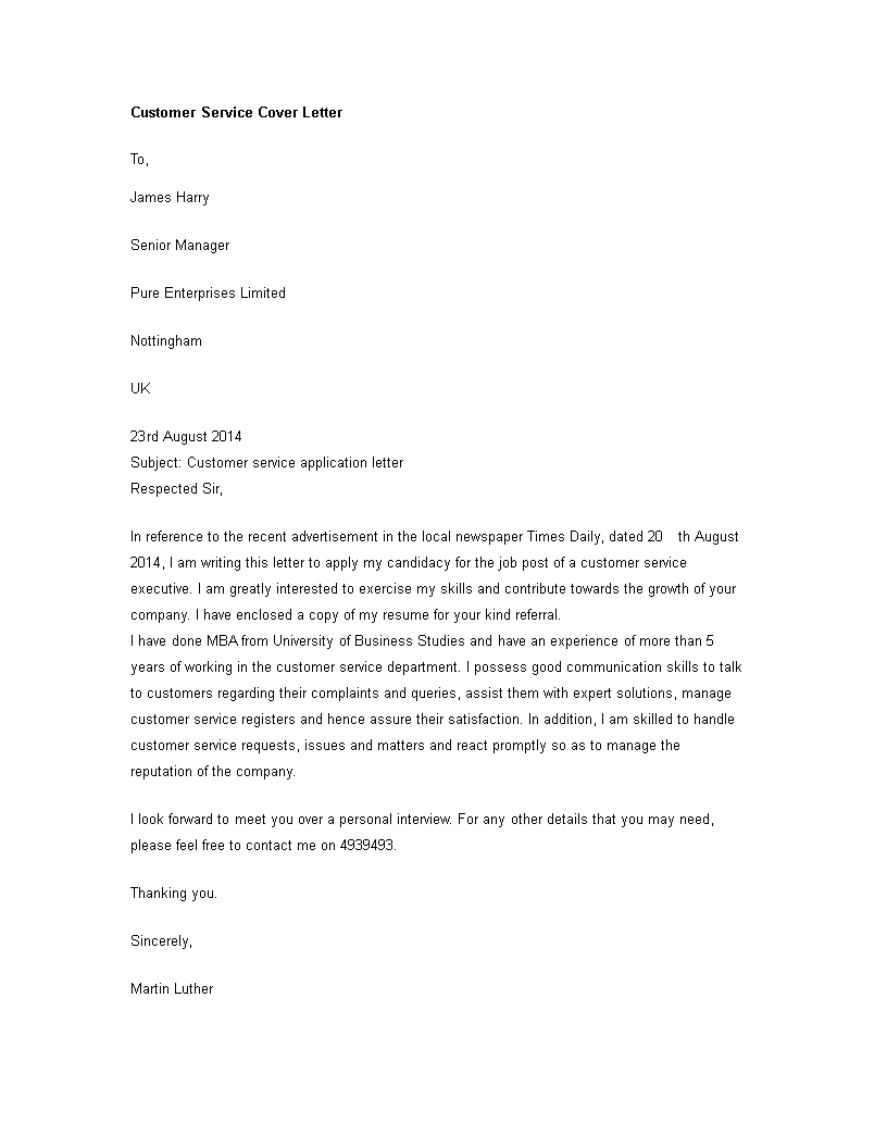 Customer Service Cover Letter To, James Harry Senior Manager Pure Enterprises Limited Nottingham UK 23rd August 2014 Subject: Customer service application letter Respected Sir, In reference to the recent advertisement in the local newspaper Times Daily, dated 20th August 2014, I am writing this letter to apply my candidacy for the job post of a customer service executive..
