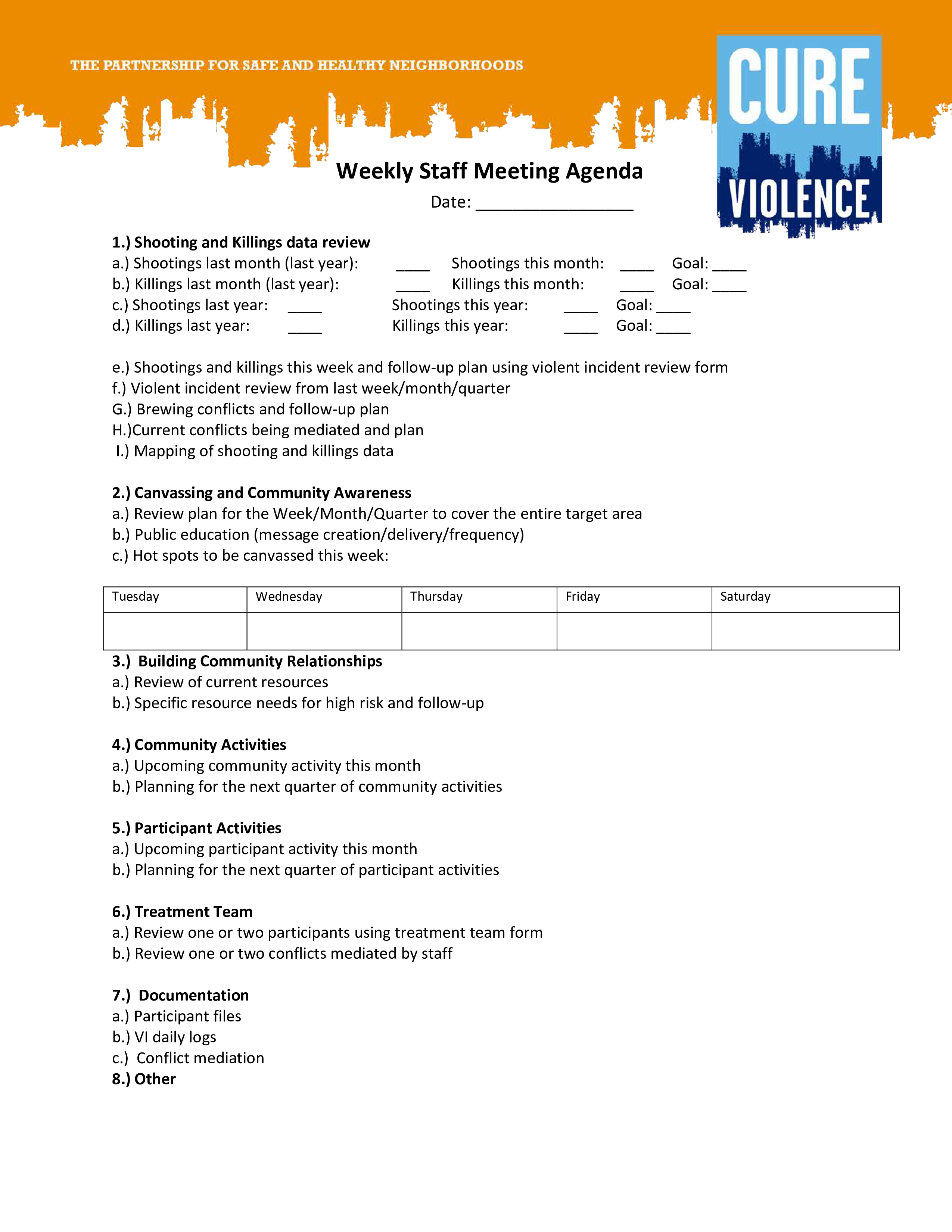 A Weekly Neighborhood Meeting Agenda is a document outlining the topics and activities to be discussed during a regular gathering of residents or stakeholders in a neighborhood or community. These meetings serve as a platform for neighbors to come together, discuss important local matters, address concerns, and collaborate on community improvement initiatives.