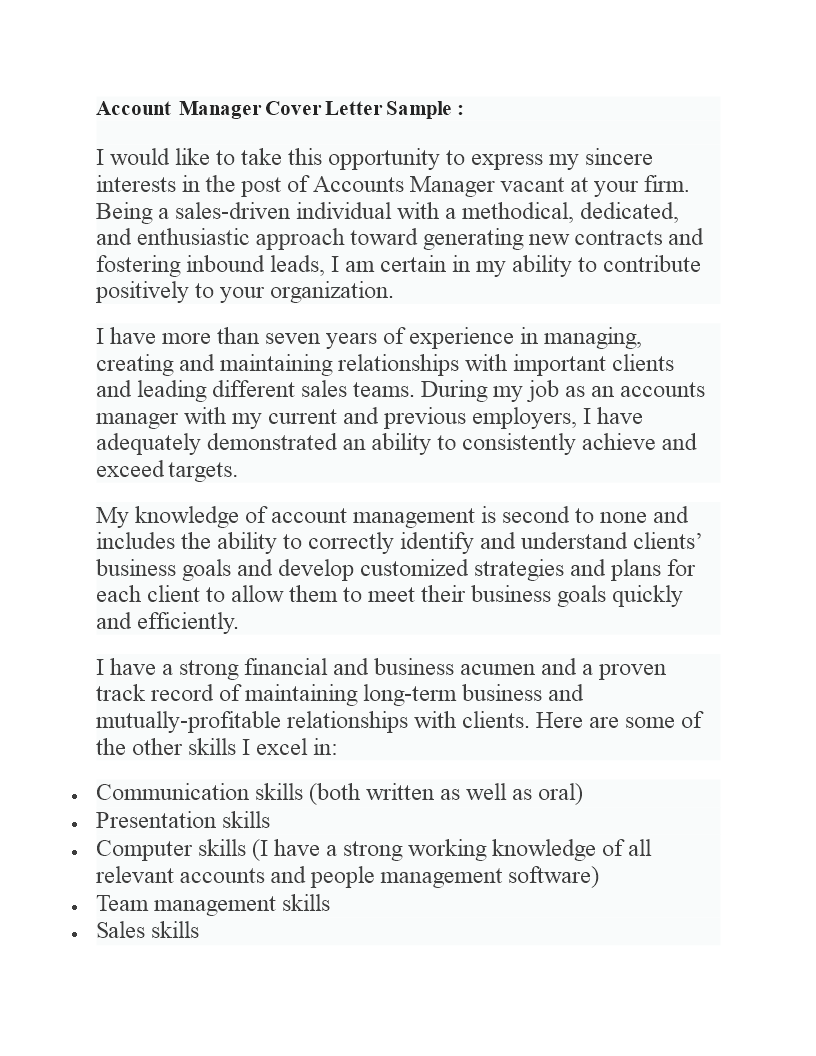 Here are some of the other skills I excel in: Communication skills (both written as well as oral) Presentation skills Computer skills (I have a strong working knowledge of all relevant accounts and people management software) Team management skills Sales skills On several occasions I have received recognition and awards from senior management the most coveted being the two back to back Employee of the Year (2011 and 2012) awards from my current employer..