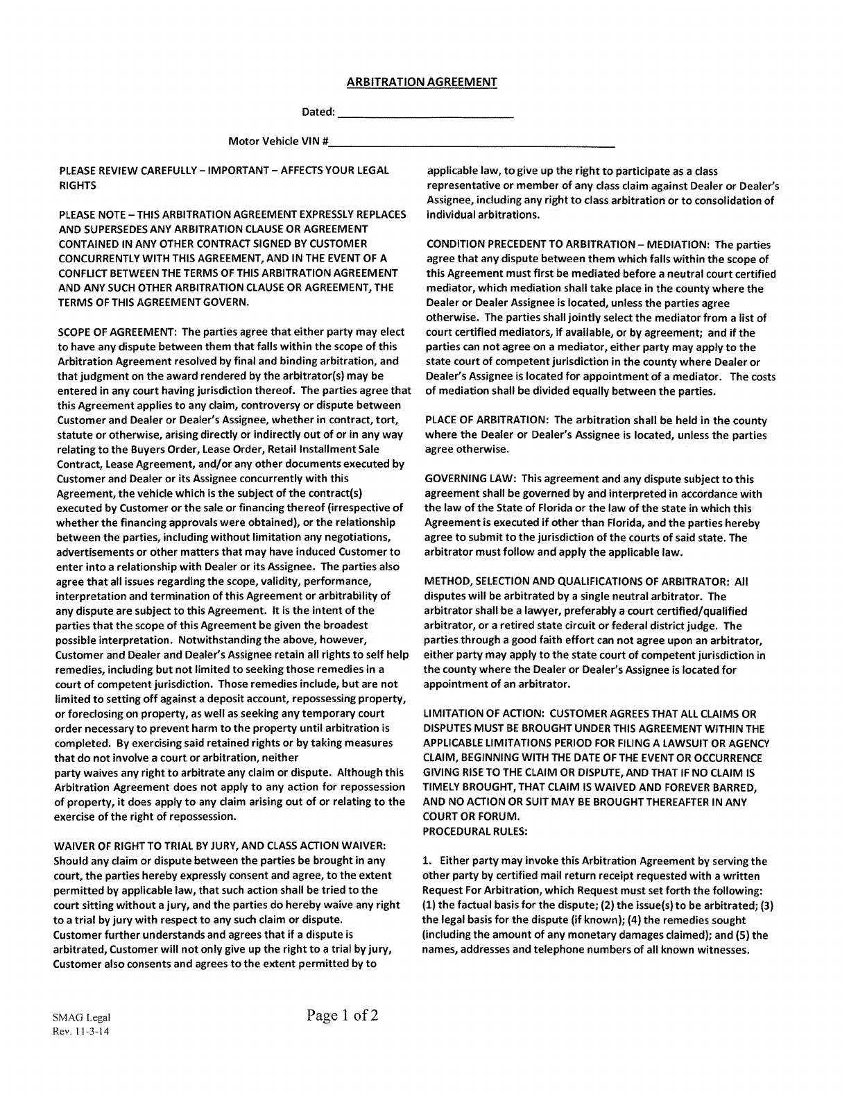 HTML Preview Vehicle Arbitration Agreement page number 1.