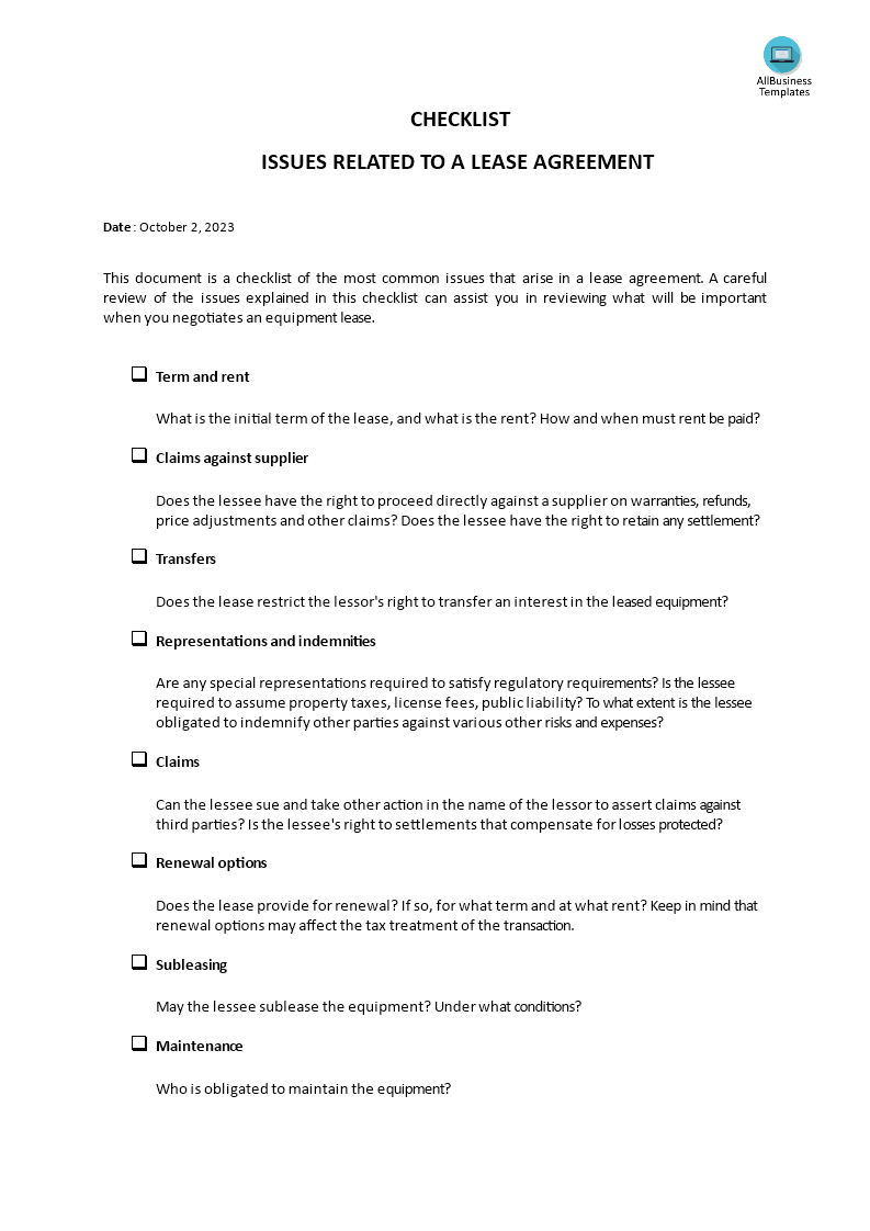 Here is a checklist of common lease agreement issues that should be reviewed: