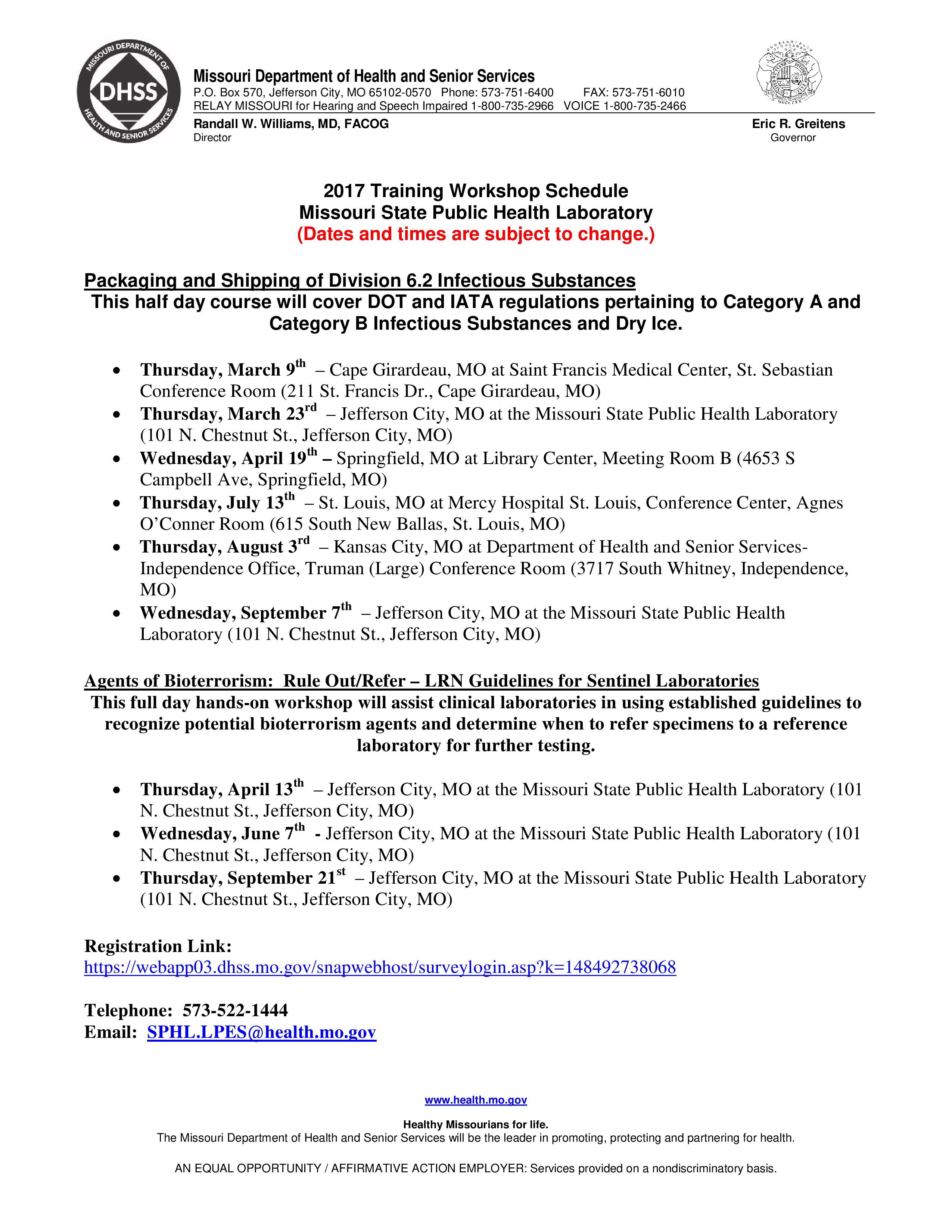 Chestnut St., Jefferson City, MO) • Wednesday, April 19th – Springfield, MO at Library Center, Meeting Room B (4653 S Campbell Ave, Springfield, MO) • Thursday, July 13th – St. Louis, MO at Mercy Hospital St. Louis, Conference Center, Agnes O’Conner Room (615 South New Ballas, St. Louis, MO) • Thursday, August 3rd – Kansas City, MO at Department of Health and Senior ServicesIndependence Office, Truman (Large) Conference Room (3717 South Whitney, Independence, MO) • Wednesday, September 7th – Jefferson City, MO at the Missouri State Public Health Laboratory (101 N..